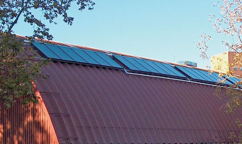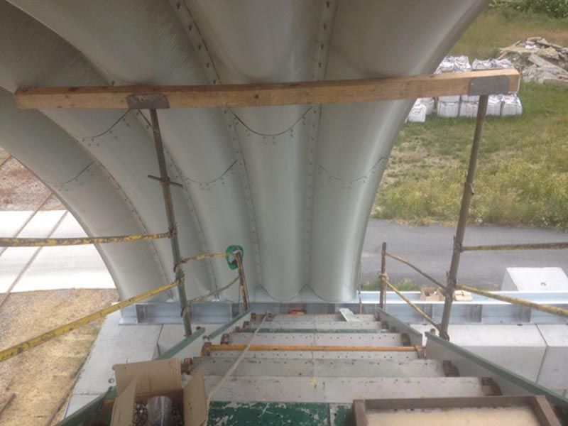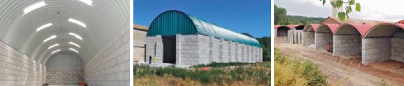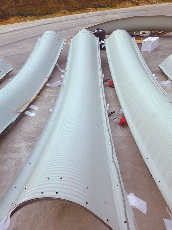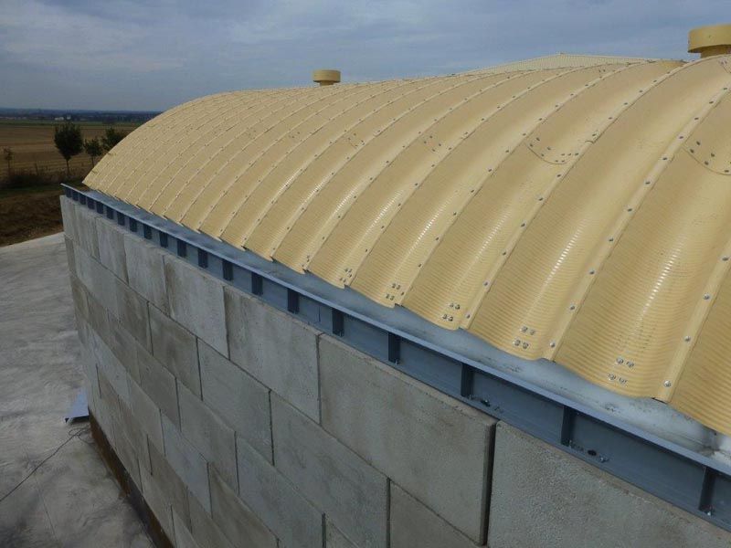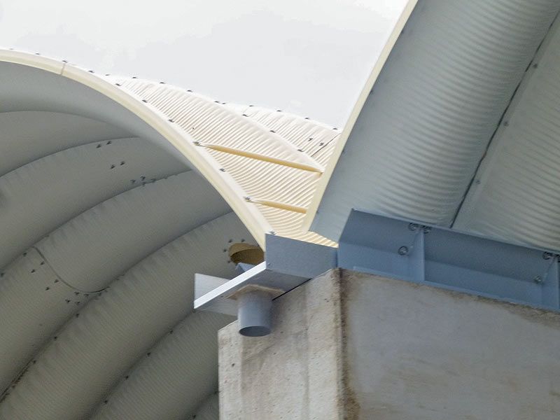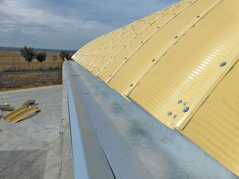 Ces toitures sont réalisées dans des tôles d'acier cintrées et nervurées d'une épaisseur variable de 0.8 à 1.5 mm compte tenu de la portée et des conditions de neige et vent. Ces tôles sont boulonnées entre elles et sont fixées sur un rail spécial qui est solidarisé avec le mur porteur sur toute la longueur.